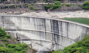 金華市東陽(yáng)八達(dá)水庫(kù),?。?)型水庫(kù),水庫(kù)大壩壩型為對(duì)數(shù)螺旋線型雙曲砼拱壩,壩高73m,總庫(kù)客999萬(wàn)m3